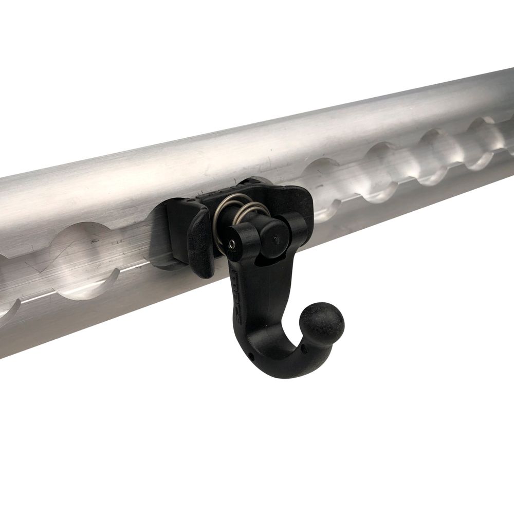 Designed with functionality in mind, the VersaTie hook is injection-molded out of a nylon-infused composite that yields a final hook strength of up to 75 lbs. Like our single stud tie-down ring, the hook articulates and folds so the orientation of the track is no concern... ceiling, walls, vertically-mounted... no problem! The hook will swivel to accommodate any and all of orientations.