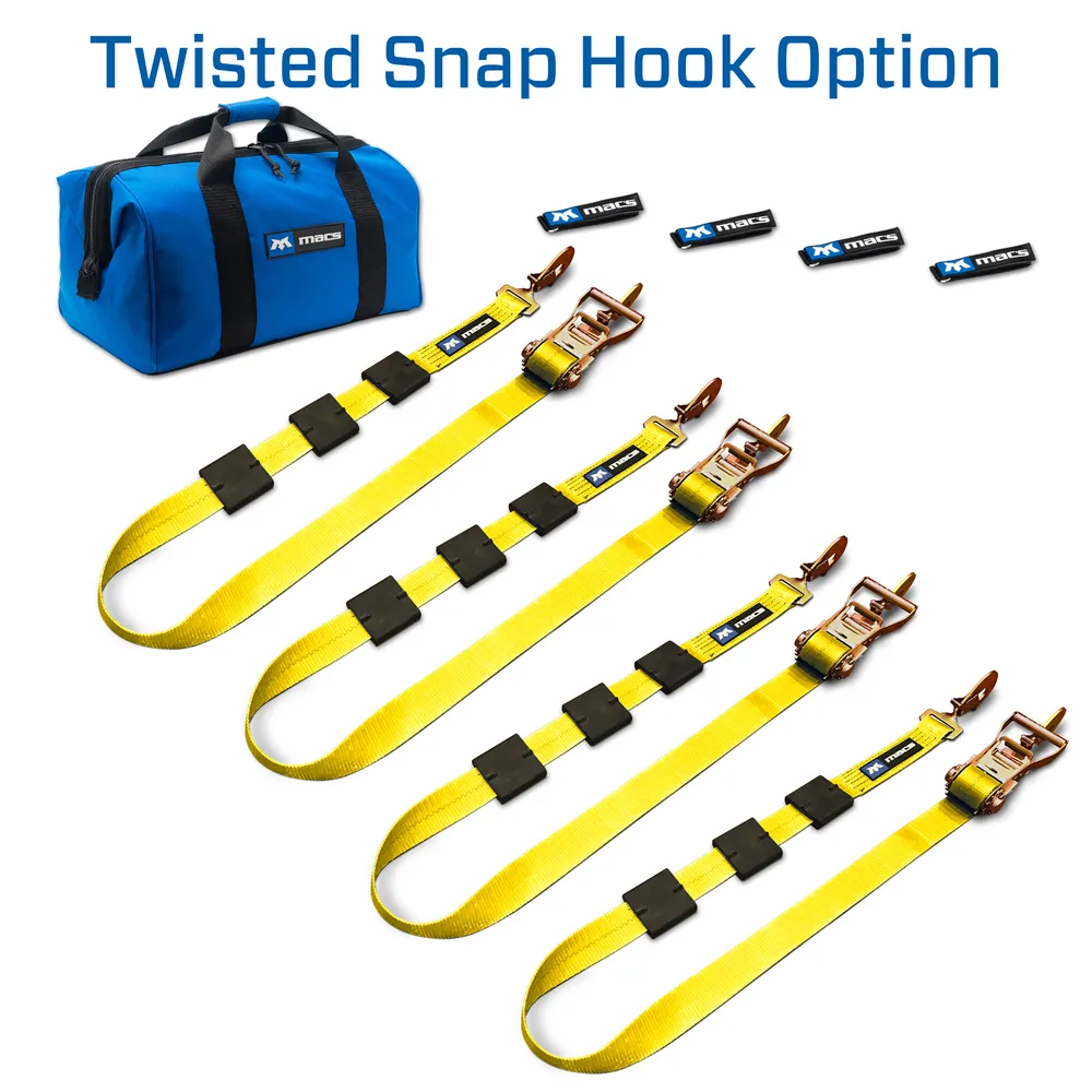 - What's included: (4) 10' Ratchet straps with tire blocks with twisted snap hook ends, (4) strap wraps and (1) large canvas storage bag