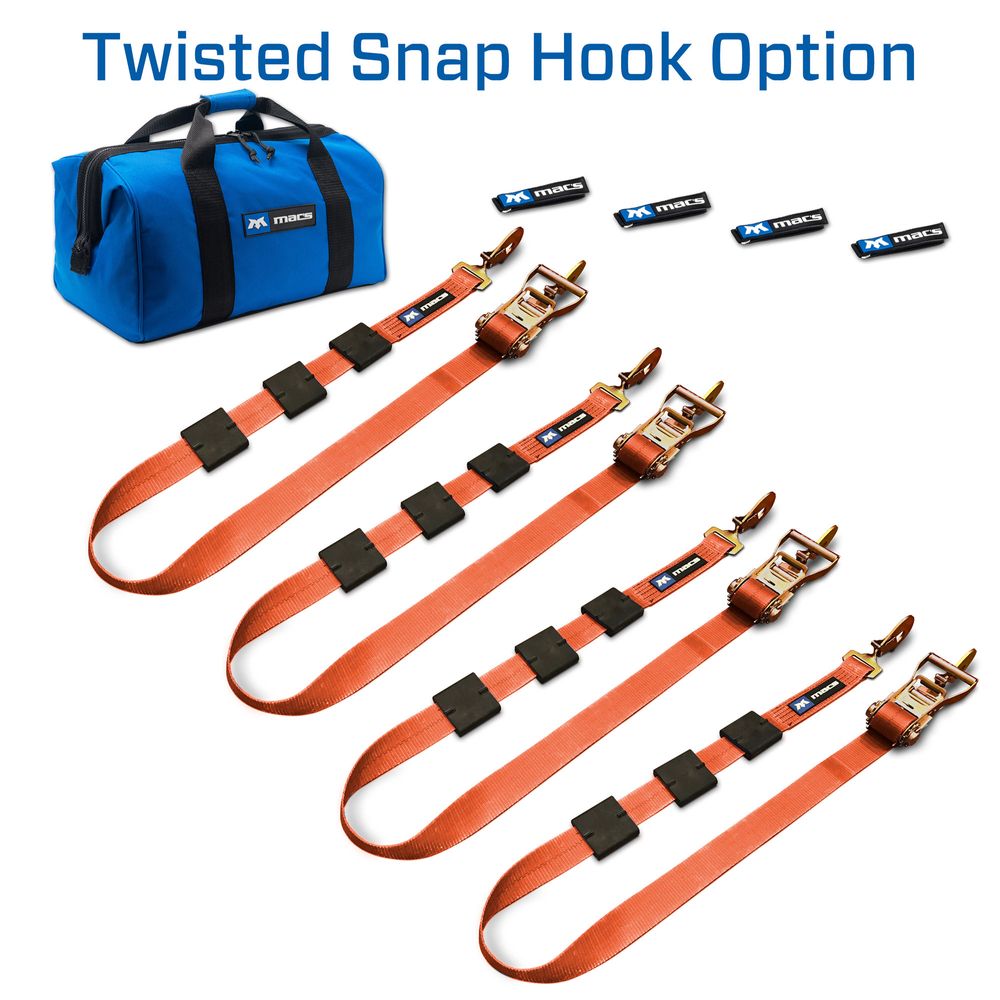 - What's included: (4) 10' Ratchet straps with tire blocks with twisted snap hook ends, (4) strap wraps and (1) large canvas storage bag