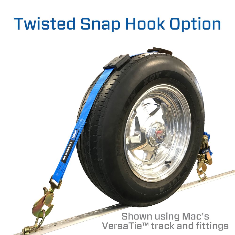 The generous 10' strap and moveable tire blocks adjust to fit any tire size, making them ideal for commercial carriers or anyone needing to secure a variety of vehicles. The Twisted Snap Hook system consists of captive hooks at each end. The advantage of these standard hook ends is that they can be used with most anchor points (e.g., D Rings) or track system (e.g., VersaTie, E Track, etc.), provided the hard points and fittings support the 5,000 lb. load requirement. Since this option does not have an included Idler fitting, they are best suited for vehicles with larger wheel wells. If clearance is an issue, the VersaTie and E-Track options come with an idler and offer a better solution.