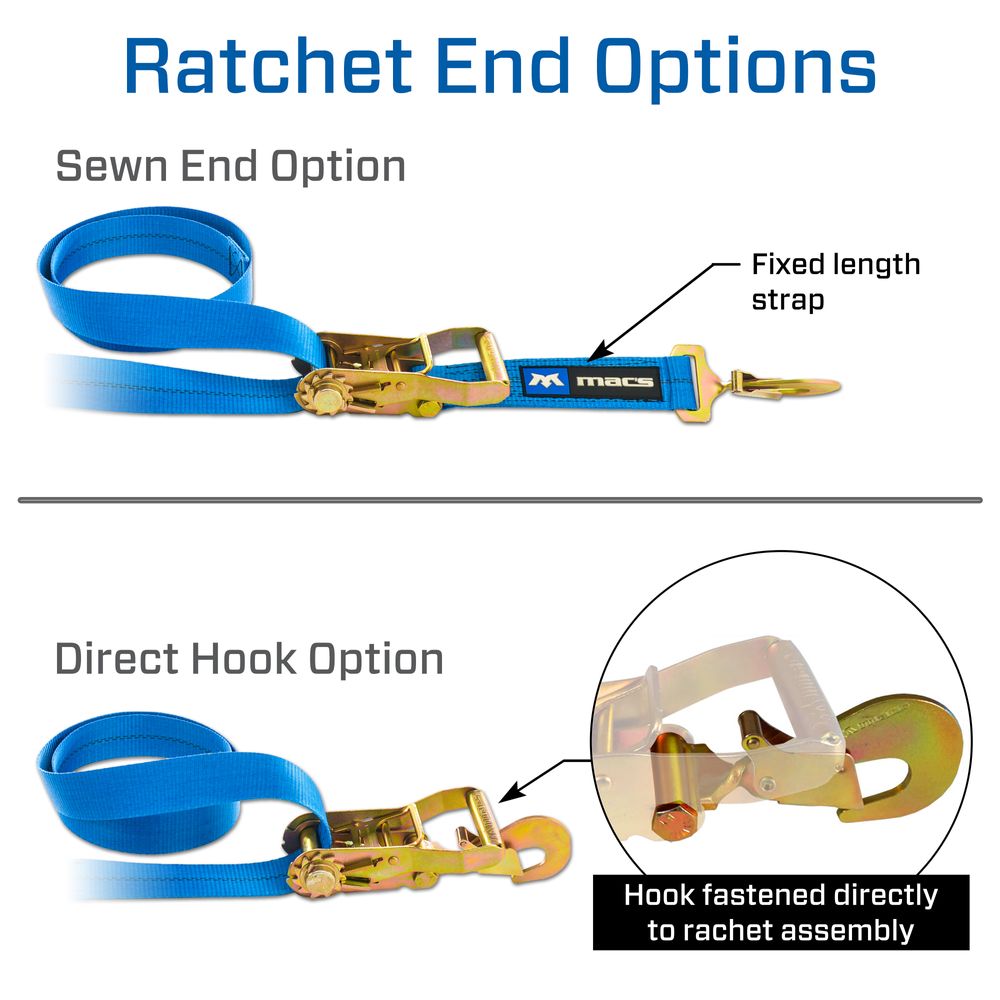 The Ultra Pack includes four 2" ratchet straps, four axle straps, four storage wraps and one large bag. Threading the axle strap around an axle of a low ground clearance vehicle can be tricky, so get the kit that makes it as easy as possible! Fabricated using the thickest material and highest stitch count available, each strap is rated for a 10,000 lb. Minimum Break Strength (MBS). The hooks on both ends are designed so the latches are oriented perfectly when attaching to trailer mount points.