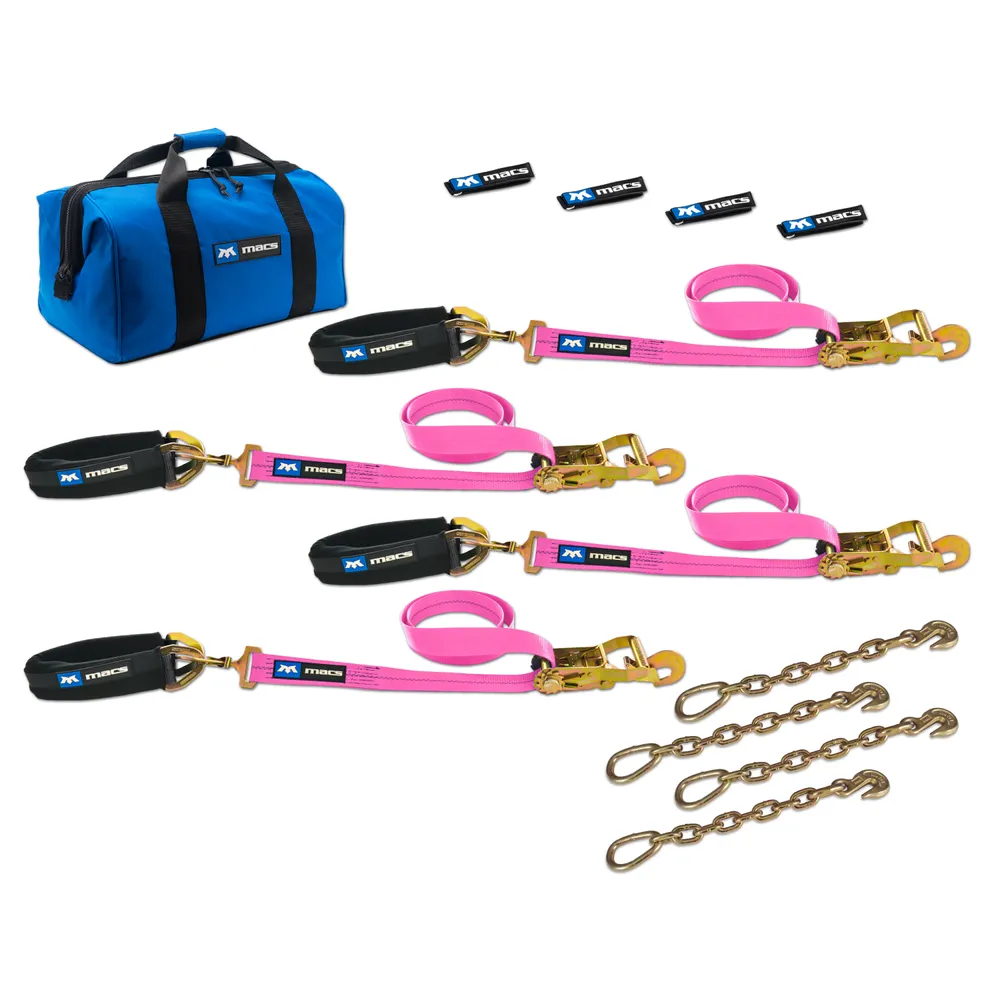 2" x 8' Pro Pack Premium Tie-Down Strap Kit with 24" Axle Strap, Direct Hook Ends & Chain Extensions - Pink