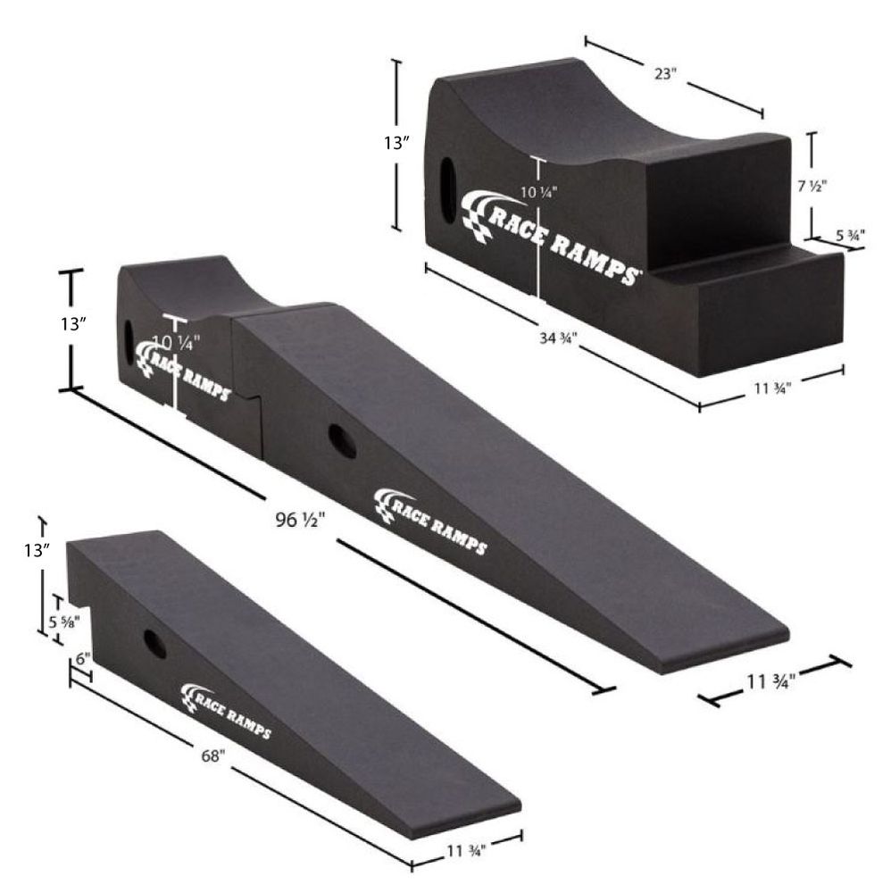 These low-maintenance ramps are 68 inches long with a 6-inch lip that connects to a 34.75-inch long cradle stand. The ramps have a 10-degree incline, and the stands support tires at a lift height of 10.25 inches. Once the tires are cradled in the stands, the interlocking incline ramps can be separated from the stands for better access to the underside of the vehicle.